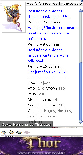 Cajado feito com engrenagens que simbolizam o Grande Arquiteto do universo. -------------------------- Indestrutível em batalha. -------------------------- Habilita [Bênção] nv.1. Resistência as raças Humano e Doram +10%. -------------------------- A cada refino: HP e SP máx. +2%. Dano mágico +6%. Pós-conjuração -1%. -------------------------- Refino +5 ou mais: Resistência a danos físicos a distância +5%. Refino +7 ou mais: Nível de [Bênção] igual ao nível de refino da arma até o +10. Refino +9 ou mais: Resistência a danos físicos a distância +5% adicional. Refino +10 ou mais: Conjuração fixa -70%. -------------------------- Tipo: Cajado ATQ: 280 ATQM: 180 Peso: 200 Nível da arma: 4 Nível necessário: 100 Classes: Magos, Noviços, Espiritualistas e evoluções