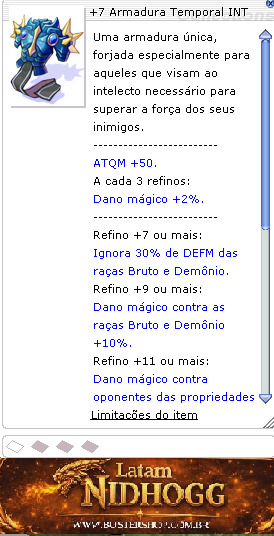 Refino +7 ou mais: Ignora 30% de DEFM das raças Bruto e Demônio. Refino +9 ou mais: Dano mágico contra as raças Bruto e Demônio +10%. Refino +11 ou mais: Dano mágico contra oponentes das propriedades Vento e Terra +10%. ------------------------- Conjunto Bota Temporal INT [1]ou Bota Modificada INT [1] Dano mágico +10%. Soma dos refinos da Armadura e Bota for 21 ou mais: Ignora 20% adicional de DEFM das raças Bruto e Demônio. -------------------------