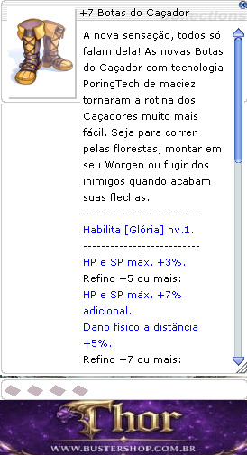 A nova sensação, todos só falam dela! As novas Botas do Caçador com tecnologia PoringTech de maciez tornaram a rotina dos Caçadores muito mais fácil. Seja para correr pelas florestas, montar em seu Worgen ou fugir dos inimigos quando acabam suas flechas. -------------------------- Habilita [Glória] nv.1. -------------------------- HP e SP máx. +3%. Refino +5 ou mais: HP e SP máx. +7% adicional. Dano físico a distância +5%. Refino +7 ou mais: HP e SP máx. +10% adicional. Dano físico a distância +5% adicional. -------------------------- A cada nível de [Ilimitar]: Pós-conjuração -8%. -------------------------- A cada nível de [Montaria em Worg]: Dano físico contra todos os Tamanhos +5%. -------------------------- Ao aprender [Disparo Certeiro] nv.10: Dano crítico +25%. Anula a penalidade de Tamanho da arma. -------------------------- Ao aprender [Armadilha Energizada] nv.5: Todos os atributos +10. Custo de SP de [Camuflagem] -20. -------------------------- Tipo: Calçado DEF: 12 DEFM: 10 Peso: 20 Nível necessário: 100 Classes: Todas