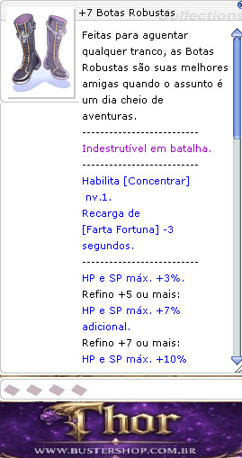 Feitas para aguentar qualquer tranco, as Botas Robustas são suas melhores amigas quando o assunto é um dia cheio de aventuras. -------------------------- Indestrutível em batalha. -------------------------- Habilita [Concentração] nv.1. Recarga de [Farta Fortuna] -3 segundos. -------------------------- HP e SP máx. +3%. Refino +5 ou mais: HP e SP máx. +7% adicional. Refino +7 ou mais: HP e SP máx. +10% adicional. -------------------------- Ao aprender [Salto Etéreo] nv.1: Velocidade de ataque +20%. Custo de SP de [Salto Etéreo] -20. -------------------------- Ao aprender [Explosão Antimatéria] nv.5: Ignora 100% da DEF de todas as raças. Ao usar [Execução], ativa [Farta Fortuna]. -------------------------- A cada nível de [Tiro Neutralizante]: Dano de [Tiro Neutralizante] +60%. Conjuração fixa de [Tiro Neutralizante] -20%. -------------------------- A cada nível de [Disparo Labareda]: Dano físico +4%. Dano de [Disparo Labareda] +50%. -------------------------- A cada nível de [Arremessar Granada]: Pós-conjuração -8%. Dano de [Arremessar Granada] +40%. -------------------------- Tipo: Calçado DEF: 12 DEFM: 10 Peso: 40 Nível necessário: 100 Classes: Todas