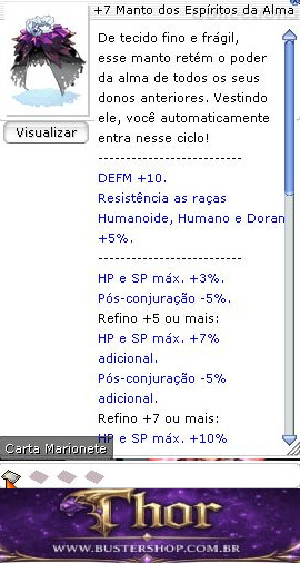 De tecido fino e frágil, esse manto retém o poder da alma de todos os seus donos anteriores. Vestindo ele, você automaticamente entra nesse ciclo! -------------------------- DEFM +10. Resistência as raças Humanoide, Humano e Doram +5%. -------------------------- HP e SP máx. +3%. Pós-conjuração -5%. Refino +5 ou mais: HP e SP máx. +7% adicional. Pós-conjuração -5% adicional. Refino +7 ou mais: HP e SP máx. +10% adicional. Pós-conjuração -5% adicional. -------------------------- Conjunto [Carta Marionette] Resistência a propriedade Fantasma +45%. -------------------------- Conjunto [Carta Orc Zumbi] Resistência a propriedade Maldito +45%. -------------------------- Conjunto [Carta Névoa] Resistência a propriedade Veneno +45%. -------------------------- Conjunto [Carta Eclipse] Resistência a propriedade Sagrado +75%. A cada nivel de [Fé]: Resistência a propriedade Sagrado -5%. -------------------------- Tipo: Capa Defesa: 12 Peso: 90 Nível necessário: 100 Classes: Todas