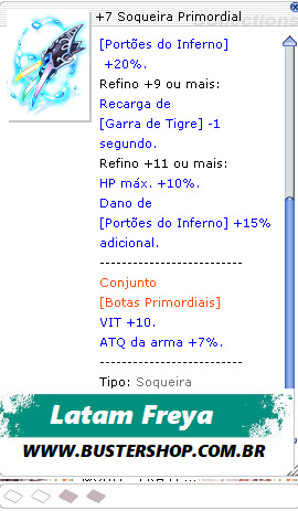 Refino +7 ou mais: Dano de [Garra de Tigre] +15%. Dano de [Portões do Inferno] +20%. Refino +9 ou mais: Recarga de [Garra de Tigre] -1 segundo. Refino +11 ou mais: HP máx. +10%. Dano de [Portões do Inferno] +15% adicional. -------------------------- Conjunto [Botas Primordiais] VIT +10. ATQ da arma +7%. --------------------------