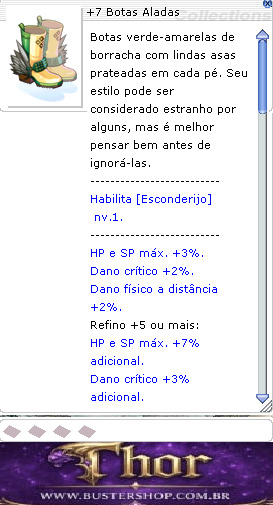 Botas verde-amarelas de borracha com lindas asas prateadas em cada pé. Seu estilo pode ser considerado estranho por alguns, mas é melhor pensar bem antes de ignorá-las. DEFM +15. HP e SP máx. +3%. Dano crítico +2%. Dano físico a distância +2%. Habilita [Esconderijo] nv. 1.