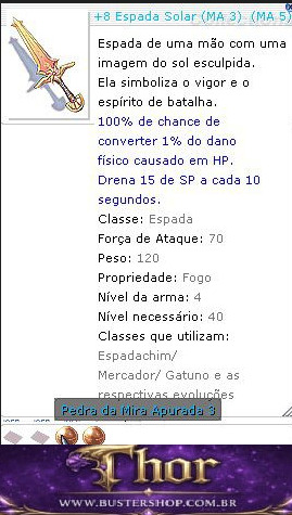 Espada de uma mão com uma imagem do sol esculpida. Ela simboliza o vigor e o espírito de batalha. 100% de chance de converter 1% do dano físico causado em HP. Drena 15 de SP a cada 10 segundos.