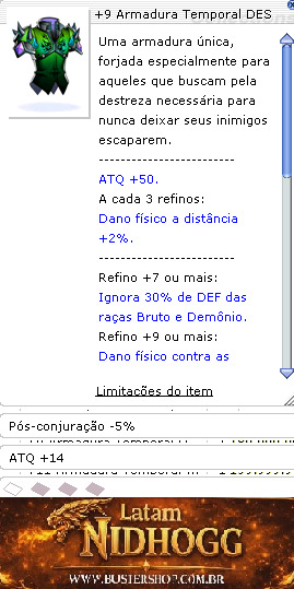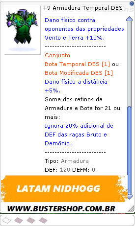 Refino +7 ou mais: Ignora 30% de DEF das raças Bruto e Demônio. Refino +9 ou mais: Dano físico contra as raças Bruto e Demônio +10%. Refino +11 ou mais: Dano físico contra oponentes das propriedades Vento e Terra +10%. ------------------------- Conjunto Bota Temporal DES [1]ou Bota Modificada DES [1] Dano físico a distância +5%. Soma dos refinos da Armadura e Bota for 21 ou mais: Ignora 20% adicional de DEF das raças Bruto e Demônio. -------------------------