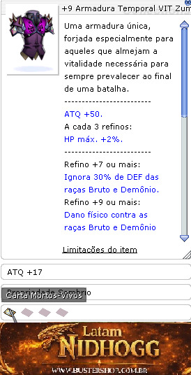 Refino +7 ou mais: Ignora 30% de DEF das raças Bruto e Demônio. Refino +9 ou mais: Dano físico contra as raças Bruto e Demônio +10%. Refino +11 ou mais: Dano físico contra oponentes das propriedades Vento e Terra +10%. ------------------------- Conjunto Bota Temporal VIT [1]ou Bota Modificada VIT [1] HP máx. +10%. Soma dos refinos da Armadura e Bota for 21 ou mais: Ignora 20% adicional de DEF das raças Bruto e Demônio. -------------------------