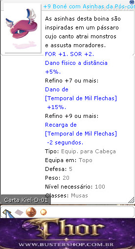 As asinhas desta boina são inspiradas em um pássaro cujo canto atrai monstros e assusta moradores. FOR +1. SOR +2. Dano físico a distância +5%.
