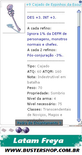 Tipo:Cajado ATQ:60ATQM:160 Peso:70 Propriedade:Sombrio Nível da arma:4 Nível necessário:75 Classes:Transcendentais de Noviços, Magos e evoluções