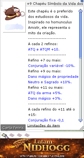 Refino +7 ou mais: Conjuração variável -10%. Refino +9 ou mais: Dano mágico de propriedade Neutro e Sagrado +10%. Refino +11 ou mais: ATQ da arma +5%. Dano mágico +3%. -------------------------