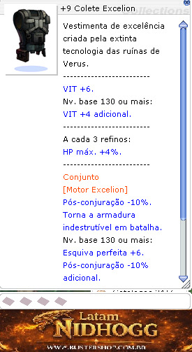 A cada 3 refinos: HP máx. +4%. ------------------------- Conjunto [Motor Excelion] Pós-conjuração -10%. Torna a armadura indestrutível em batalha. Nv. base 130 ou mais: Esquiva perfeita +6. Pós-conjuração -10% adicional. -------------------------