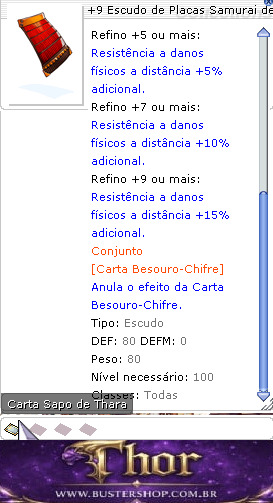 Refino +9 ou mais: Resistência a danos físicos a distância +15% adicional. Conjunto [Carta Besouro-Chifre] Anula o efeito da Carta Besouro-Chifre.