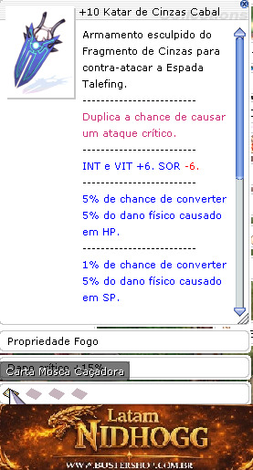 Tipo:Katar ATQ:220ATQM:80 Peso:180 Nível da arma:4 Nível necessário:120 Classes:Sicários e evoluções
