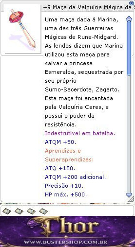 Uma maça dada à Marina, uma das três Guerreiras Mágicas de Rune-Midgard. As lendas dizem que Marina utilizou esta maça para salvar a princesa Esmeralda, sequestrada por seu próprio Sumo-Sacerdote, Zagarto. Esta maça foi encantada pela Valquíria Ceres, e possui o poder da resistência.