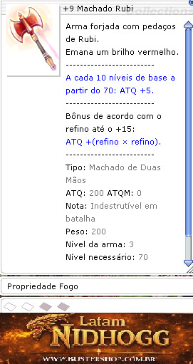 Tipo:Machado de Duas Mãos ATQ:200ATQM:0 Nota:Indestrutível em batalha Peso:200 Nível da arma:3 Nível necessário:70 Classes:Espadachins, Mercadores e evoluções