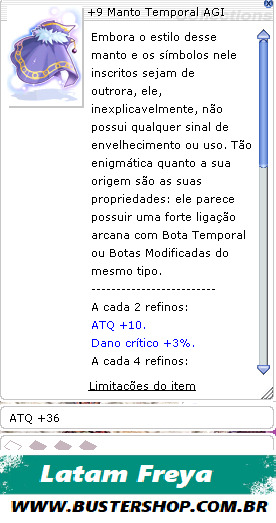 Embora o estilo desse manto e os símbolos nele inscritos sejam de outrora, ele, inexplicavelmente, não possui qualquer sinal de envelhecimento ou uso. Tão enigmática quanto a sua origem são as suas propriedades: ele parece possuir uma forte ligação arcana com Botas Temporais ou Botas Modificadas do mesmo tipo.
