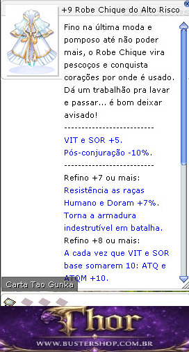 Fino na última moda e pomposo até não poder mais, o Robe Chique vira pescoços e conquista corações por onde é usado. Dá um trabalhão pra lavar e passar... é bom deixar avisado! -------------------------- VIT e SOR +5. Pós-conjuração -10%. -------------------------- Refino +7 ou mais: Resistência as raças Humano e Doram +7%. Torna a armadura indestrutível em batalha. Refino +8 ou mais: A cada vez que VIT e SOR base somarem 10: ATQ e ATQM +10. Refino +9 ou mais: Tolerância a Petrificação +50%. -------------------------- Conjunto [Carta Amdarais Imortal] Tolerância a Petrificação +50% adicional. Dano físico e mágico contra as raças Dragão e Anjo +40%. -------------------------- Tipo: Armadura DEF: 35 DEFM: 10 Peso: 50 Nível necessário: 100 Classes: Todas
