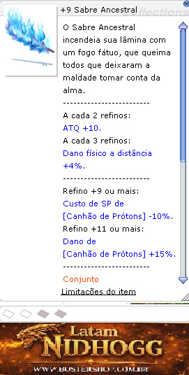 Refino +9 ou mais: Custo de SP de [Canhão de Prótons] -10%. Refino +11 ou mais: Dano de [Canhão de Prótons] +15%. ------------------------- Conjunto [Botas Ancestrais] Ao realizar ataques físicos: 3% de chance de ativar um [efeito] por 7 segundos. ------------------------- Efeito: DES +20. Dano físico a distância +10%. -------------------------