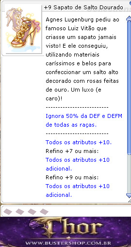 Agnes Lugenburg pediu ao famoso Luiz Vitão que criasse um sapato jamais visto! E ele conseguiu, utilizando materiais caríssimos e belos para confeccionar um salto alto decorado com rosas feitas de ouro. Um luxo (e caro)! -------------------------- Ignora 50% da DEF e DEFM de todas as raças. -------------------------- Todos os atributos +10. Refino +7 ou mais: Todos os atributos +10. Refino +9 ou mais: Todos os atributos +10. -------------------------- Tipo:Calçado DEF:10 DEFM:10 Peso:50 Nível necessário:100 Classes:Todas