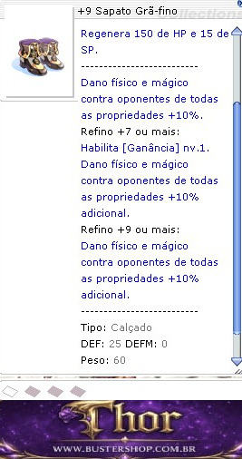 Sapatos chiques e luxuosos que definitivamente custam os olhos da cara. -------------------------- Ao derrotar monstros com qualquer ataque: Regenera 150 de HP e 15 de SP. -------------------------- Dano físico e mágico contra oponentes de todas as propriedades +10%. Refino +7 ou mais: Habilita [Ganância] nv.1. Dano físico e mágico contra oponentes de todas as propriedades +10% adicional. Refino +9 ou mais: Dano físico e mágico contra oponentes de todas as propriedades +10% adicional. -------------------------- Tipo: Calçado DEF: 25 DEFM: 0 Peso: 60 Nível necessário: 100 Classes: Todas