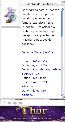 Consagrado com as bênçãos dos deuses, este par de sapatos pertenceu ao famoso exorcista Padre Quededo. Este calçado é perfeito para aqueles que desejam a expiação das mazelas e pecados do passado. -------------------------- Dano de [Judex] +30%. -------------------------- HP e SP máx. +2%. Dano mágico +2%. Dano mágico de propriedade Sagrado +2%. Refino +5 ou mais: HP e SP máx. +7% adicional. Dano mágico +3% adicional. Dano mágico de propriedade Sagrado +3% adicional. Refino +7 ou mais: HP e SP máx. +10% adicional. Dano mágico +5% adicional. Dano mágico de propriedade Sagrado +5% adicional. -------------------------- Conjunto [Vara Sagrada] A cada nível aprendido de [Lauda Ramus], [Lauda Agnus] ou [Gênese]: Dano de [Adoramus] +10%. A cada nível aprendido de [Oratio]: Conjuração variável de [Adoramus] e [Judex] -5%. Arma com refino +7 ou mais: Dano mágico contra as raças Morto-Vivo e Demônio +30%. Dano mágico contra as propriedades Maldito e Sombrio +30%. Arma com refino +9 ou mais: Dano de [Adoramus] +20%. Dano mágico contra as raças Morto-Vivo e Demônio +20% adicional. Dano mágico contra as propriedades Maldito e Sombrio +20% adicional. -------------------------- Tipo: Calçado DEF: 15 DEFM: 15 Peso: 50 Nível necessário: 100 Classes: Todas