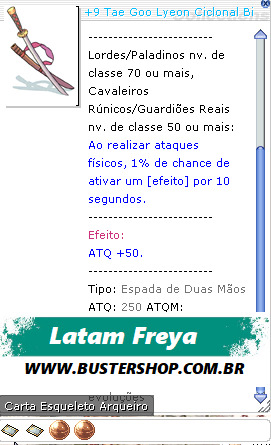 Arma sagrada de um guerreiro do oriente. Esquiva perfeita +10. Refino +9 ou mais: Pós-conjuração -20%. Custo de SP das habilidades -20%. Lordes e Paladinos: Nv. de classe 70 ou mais: Ao realizar ataques físicos, 1% de chance de ativar [ATQ +50] por 10 segundos. Cavaleiros Rúnicos: Nv. de classe 50 ou mais: Ao realizar ataques físicos, 1% de chance de ativar [ATQ +50] por 10 segundos. Tipo: Espada de Duas Mãos Ataque: 250 Peso: 200 Nível da arma: 4 Nível necessário: 90 Classes: Espadachins T. e evoluções