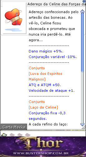 Adereço confeccionado pelo artesão das bonecas. Ao vê-lo, Celine ficou obcecada e prometeu que nunca iria perdê-lo. Até agora... -------------------------- Dano mágico +5%. Conjuração variável -10%. -------------------------- Conjunto [Luva dos Espíritos Malignos] ATQ e ATQM +50. Velocidade de ataque +1. -------------------------- Conjunto [Laço da Celine] Conjuração fixa -0,3 segundos. A cada refino do laço: ATQM +10. Refino +7 ou mais: Dano mágico contra as raças Humano, Humanoide e Demônio +10%. Refino +9 ou mais: Dano mágico de propriedade Água, Vento, Terra, Fogo e Neutro +10%. Refino +11 ou mais: Dano mágico contra monstros Chefes +20%. -------------------------- Tipo: Acessório DEF: 0 DEFM: 0 Peso: 50 Nível necessário: 100 Classes: Todas