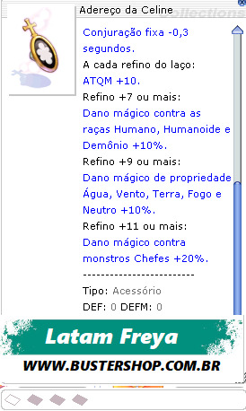 -------------------------- Dano mágico +5%. Conjuração variável -10%. -------------------------- Conjunto [Luva dos Espíritos Malignos] ATQ e ATQM +50. Velocidade de ataque +1. -------------------------- Conjunto [Laço da Celine] Conjuração fixa -0,3 segundos. A cada refino do laço: ATQM +10. Refino +7 ou mais: Dano mágico contra as raças Humano, Humanoide e Demônio +10%. Refino +9 ou mais: Dano mágico de propriedade Água, Vento, Terra, Fogo e Neutro +10%. Refino +11 ou mais: Dano mágico contra monstros Chefes +20%. --------------------------