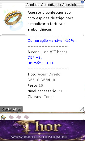 Acessório confeccionado com espigas de trigo para simbolizar a fartura e ambundância. -------------------------- Conjuração variável -10%. -------------------------- A cada 1 de VIT base: DEF +2. HP máx. +100. -------------------------- Tipo: Acessório DEF: 0 DEFM: 0 Peso: 10 Nível necessário: 100 Classes: Todas