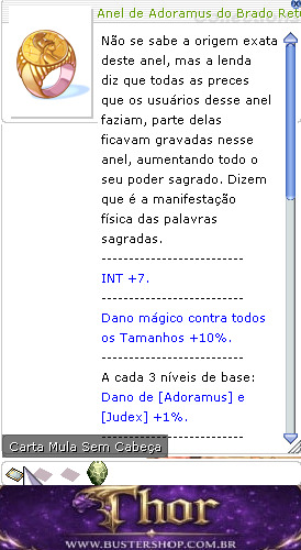 Não se sabe a origem exata deste anel, mas a lenda diz que todas as preces que os usuários desse anel faziam, parte delas ficavam gravadas nesse anel, aumentando todo o seu poder sagrado. Dizem que é a manifestação física das palavras sagradas. -------------------------- INT +7. -------------------------- Dano mágico contra todos os Tamanhos +10%. -------------------------- A cada 3 níveis de base: Dano de [Adoramus] e [Judex] +1%. -------------------------- Ao aprender [Oratio] nv.10: Efetividade de cura +30%. Custo de SP das habilidades -10%. Conjuração fixa de [Oratio] -100%. -------------------------- Ao aprender [Adoramus] nv.10: Velocidade de ataque +15%. Ao derrotar monstros com ataques mágicos, regenera 100 de HP e 10 de SP. -------------------------- Ao aprender [Offertorium] nv.5: Conjuração variável -30%. -------------------------- Ao aprender [Gênese] nv.5: Dano mágico de propriedade Vento, Sagrado e Neutro +10%. -------------------------- Tipo: Acessório DEF: 0 DEFM: 15 Peso: 10 Nível necessário: 100 Classes: Todas