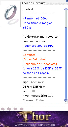 O ministério de Prontera adverte: se for casar, dê um Anel de Diamantes. O de Carnium pode apertar o dedo por causa da rigidez! -------------------------- HP máx. +1.000. Dano físico e mágico +10%. -------------------------- Ao derrotar monstros com qualquer ataque: Regenera 200 de HP. -------------------------- Conjunto [Botas Felpudas] [Palitinho de Chocolate] Ignora 25% da DEF e DEFM de todas as raças. -------------------------- Tipo: Acessório DEF: 0 DEFM: 0 Peso: 10 Nível necessário: 100 Classes: Todas