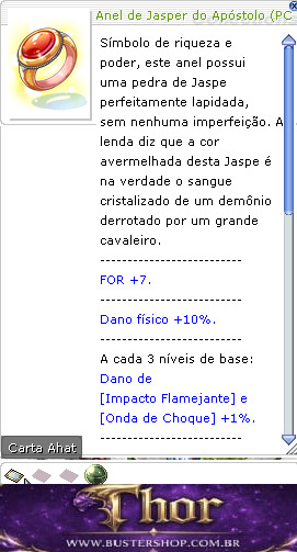 Símbolo de riqueza e poder, este anel possui uma pedra de Jaspe perfeitamente lapidada, sem nenhuma imperfeição. A lenda diz que a cor avermelhada desta Jaspe é na verdade o sangue cristalizado de um demônio derrotado por um grande cavaleiro. -------------------------- FOR +7. -------------------------- Dano físico +10%. -------------------------- A cada 3 níveis de base: Dano de [Impacto Flamejante] e [Onda de Choque] +1%. -------------------------- Ao aprender [Impacto Flamejante] nv.5: HP máx. +15%. -------------------------- Ao aprender [Vento Cortante] nv.5: Dano físico contra monstros Chefes +15%. -------------------------- Ao aprender [Revidar Dano] nv.10: Precisão perfeita +15. -------------------------- Ao aprender [Onda de Choque] nv.10: Velocidade de ataque +10%. Ao derrotar monstros com ataques físicos, regenera 100 de HP e 10 de SP. -------------------------- Tipo: Acessório DEF: 0 DEFM: 0 Peso: 40 Nível necessário: 100 Classes: Todas