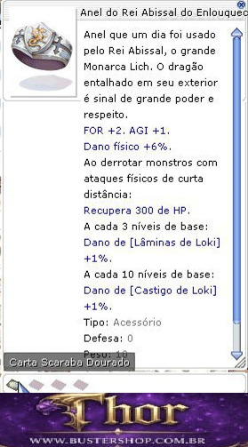 Anel que um dia foi usado pelo Rei Abissal, o grande Monarca Lich. O dragão entalhado em seu exterior é sinal de grande poder e respeito. FOR +2. AGI +1. Dano físico +6%.
