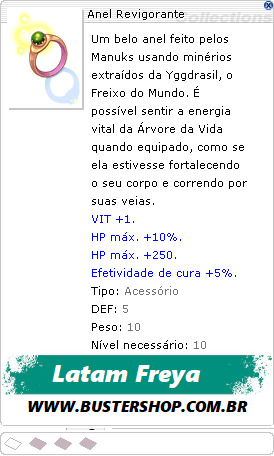 Um belo anel feito pelos Manuks usando minérios extraídos da Yggdrasil, o Freixo do Mundo. É possível sentir a energia vital da Árvore da Vida quando equipado, como se ela estivesse fortalecendo o seu corpo e correndo por suas veias. VIT +1. HP máx. +10%. HP máx. +250. Efetividade de cura +5%. Tipo:Acessório Defesa:5 Peso:10 Nível necessário:10 Classes:Todas