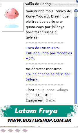 Um balão da família poring edição limitada de natal. Tem um delicioso cheirinho de bala que te deixa com vontade de comer doces. Taxa de DROP +5%. EXP adquirida por monstros +5%. Recuperação de HP da [Bala] +200%. Tipo:Equip. para Cabeça DEF:0DEFM:0 Equipa em:Baixo Peso:1 Nível necessário:1 Classe:Todas