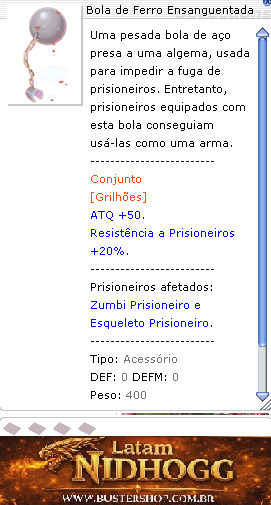 Uma pesada bola de aço presa a uma algema, usada para impedir a fuga de prisioneiros. Entretanto, prisioneiros equipados com esta bola conseguiam usá-las como uma arma. Conjunto [Grilhões] ATQ +50. Resistência a Prisioneiros +20%. Prisioneiros afetados: Zumbi Prisioneiro e Esqueleto Prisioneiro. Tipo:Acessório Defesa:0 Peso:400 Nível necessário:1 Classes:Todas, exceto Aprendizes