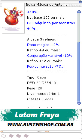 Uma bolsa que o Antonio carrega por aí quando ele quer acabar com seus inimigos à distância. É um item valioso para quem gosta de enfrentar os oponentes longe de si! -------------------------- Exibe o visual nas costas do personagem. -------------------------- Nv. base até 99: EXP adquirida por monstros +10%. Nv. base 100 ou mais: EXP adquirida por monstros +4%. -------------------------- A cada 2 refinos: Dano físico a distância +1%. Refino +9 ou mais: Velocidade de ataque +10%. Refino +12 ou mais: Pós-conjuração -7%. -------------------------- Tipo: Capa Defesa: 30 Peso: 20 Nível necessário: 1 Classes: Todas