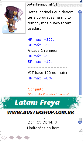 Botas incríveis que devem ter sido criadas há muito tempo, mas nunca foram usadas. HP máx. +300. SP máx. +30. A cada 3 refinos: HP máx. +300. SP máx. +10. VIT base 120 ou mais: HP máx. +8%. Conjunto [Pele da Rainha Verme] HP máx. +15%. SP máx. +5%. Tipo: Calçado Defesa: 25 Peso: 60 Nível necessário: 99 Classes: Terceiras classes