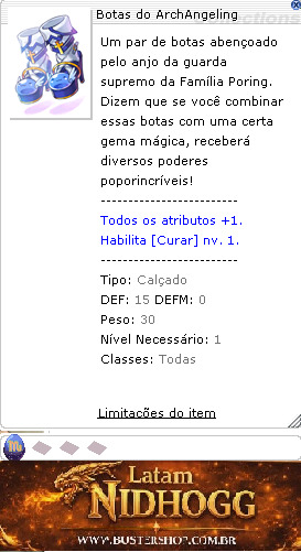 Um par de botas abençoado pelo anjo da guarda supremo da Família Poring. Dizem que se você combinar essas botas com uma certa gema mágica, receberá diversos poderes poporincríveis!