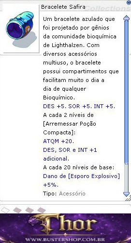 Um bracelete azulado que foi projetado por gênios da comunidade bioquímica de Lighthalzen. Com diversos acessórios multiuso, o bracelete possui compartimentos que facilitam muito o dia a dia de qualquer Bioquímico.
