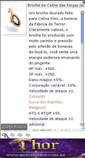 Um broche dourado feito para Celine Kimi, a boneca da Fábrica do Terror. Claramente valioso, o broche foi produzido com muito carinho e precisão pelo artesão de bonecas. Ao tocá-lo, você sente uma energia poderosa emanando do pingente.