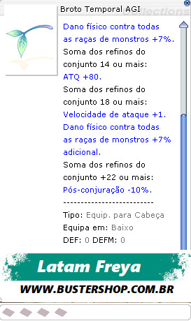 -------------------------- Conjunto [Manto Temporal AGI] [Armadura Temporal AGI] Dano físico contra todas as raças de monstros +7%. Soma dos refinos do conjunto 14 ou mais: ATQ +80. Soma dos refinos do conjunto 18 ou mais: Velocidade de ataque +1. Dano físico contra todas as raças de monstros +7% adicional. Soma dos refinos do conjunto +22 ou mais: Pós-conjuração -10%. --------------------------