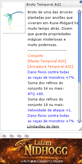 -------------------------- Conjunto [Manto Temporal AGI] [Armadura Temporal AGI] Dano físico contra todas as raças de monstros +7%. Soma dos refinos do conjunto 14 ou mais: ATQ +80. Soma dos refinos do conjunto 18 ou mais: Velocidade de ataque +1. Dano físico contra todas as raças de monstros +7% adicional. Soma dos refinos do conjunto +22 ou mais: Pós-conjuração -10%. --------------------------