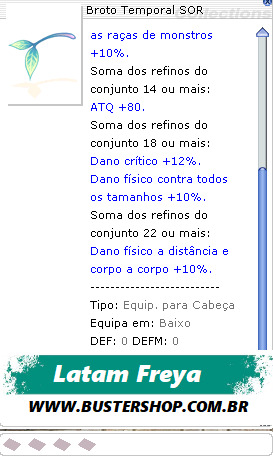 -------------------------- Conjunto [Manto Temporal SOR] [Armadura Temporal SOR] Dano físico contra todas as raças de monstros +10%. Soma dos refinos do conjunto 14 ou mais: ATQ +80. Soma dos refinos do conjunto 18 ou mais: Dano crítico +12%. Dano físico contra todos os tamanhos +10%. Soma dos refinos do conjunto 22 ou mais: Dano físico a distância e corpo a corpo +10%. --------------------------
