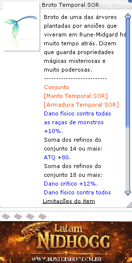 -------------------------- Conjunto [Manto Temporal SOR] [Armadura Temporal SOR] Dano físico contra todas as raças de monstros +10%. Soma dos refinos do conjunto 14 ou mais: ATQ +80. Soma dos refinos do conjunto 18 ou mais: Dano crítico +12%. Dano físico contra todos os tamanhos +10%. Soma dos refinos do conjunto 22 ou mais: Dano físico a distância e corpo a corpo +10%. --------------------------