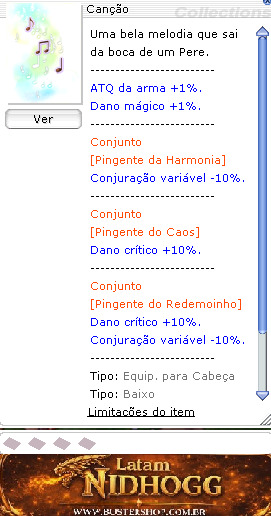 Tipo:Equip. para Cabeça Tipo:Baixo DEF:0DEFM:0 Peso:10 Nível necessário:120 Classes:Classes 3
