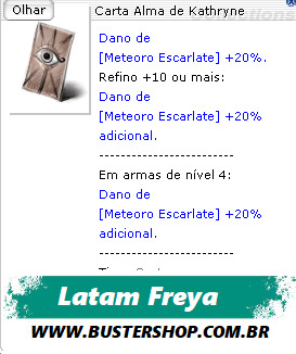 Dano de [Meteoro Escarlate] +20%. Refino +10 ou mais: Dano de [Meteoro Escarlate] +20% adicional. -------------------------- Em armas de nível 4: Dano de [Meteoro Escarlate] +20% adicional. -------------------------- Tipo: Carta Equipa em: Arma Peso: 1