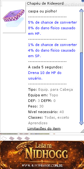 A cada 5 segundos: Drena 10 de HP do usuário. --------------------------