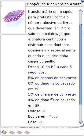 Um universitário teve a brilhante ideia de petrificar um Rideword e transformá-lo em chapéu para protestar contra o número abusivo de livros que deveriam ler. O tiro saiu pela culatra, já que a criatura continuou a distribuir suas dentadas ocasionais especialmente quando o usuário tinha caspa ou piolho! Drena 10 de HP a cada 5 segundos. 5% de chance de converter 8% do dano físico causado em HP. 1% de chance de converter 4% do dano físico causado em SP.