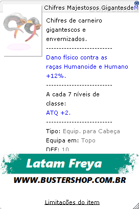 Chifres de carneiro gigantescos e envernizados. Aumenta o dano dado em monstros da raça Humanoide em 12%. Aumenta o ATQ proporcionalmente ao Nível de Classe. Classe: Equipamento para a cabeça Defesa: 10 Equipa em: Topo Peso: 80 Classes que utilizam: Todas