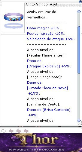 Shinobis que desafiam as tradições de suas crenças ainda se veem como Ninjas – no entanto, eles preferem se diferenciar de seus demais com acessórios azuis, em vez de vermelhos. -------------------------- Dano mágico +5%. Pós-conjuração -10%. Velocidade de ataque +5%. -------------------------- A cada nível de [Pétalas Flamejantes]: Dano de [Dragão Explosivo] +5%. A cada nível de [Lança Congelante]: Dano de [Grande Floco de Neve] +15%. A cada nível de [Lâmina de Vento]: Dano de [Brisa Cortante] +8%. A cada nível de [Assalto das Sombras]: Dano mágico contra oponentes de propriedade Sombrio +4%. A cada nível de [Chamado da Morte]: Dano mágico contra oponentes de propriedade Sombrio +4%. A cada nível de [Substituição]: Dano mágico contra oponentes de propriedade Sombrio +4%. -------------------------- Tipo: Acessório DEF: 0 DEFM: 0 Peso: 10 Nível necessário: 100 Classes: Todas